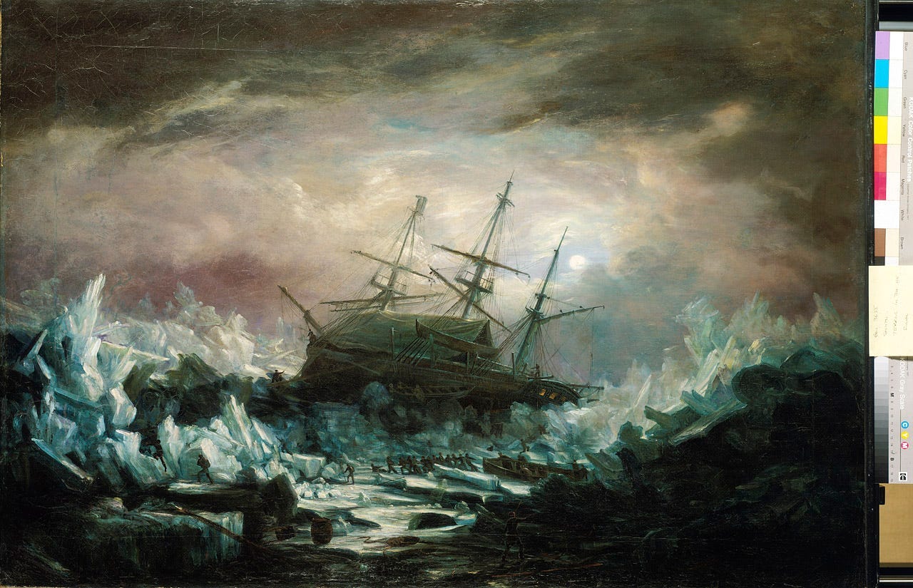 1845 年 5 月,英國海軍派出兩艘戰船 HMS Terror & Erebus,「驚恐」和「冥河」號,希望一舉勘查完「西北航道」餘下未知的 1500 公里。「驚恐」號在美國國歌裡面間接出現過:它就是整夜用火箭轟擊美軍海岸堡壘 Fort McHenry、但到白天依然打不爛堡壘國旗的其中一艘船!